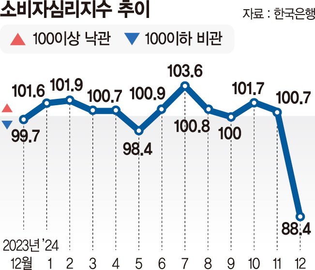 24일 한국은행이 발표한 '2024년 12월 소비자동향조사'에 따르면 이달 소비자심리지수(CCSI)는 88.4로 전월보다 12.3p 하락했다. 레고랜드 사태 직후인 2022년 11월(86.6) 이후 최저치이자 하락 폭으로는 코로나 팬데믹 시기인 지난 2020년 3월(18.3p) 이후 최대다.