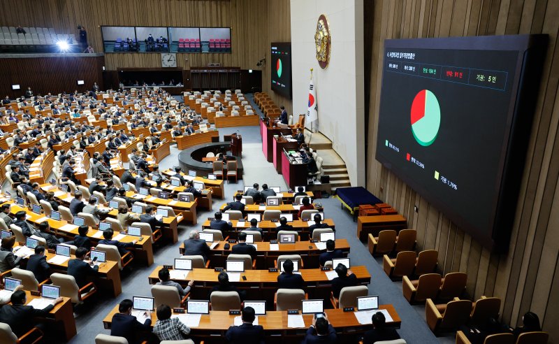 26일 오후 서울 여의도 국회에서 열린 제420회국회(임시회) 제1차 본회의에서 사립학교법 일부개정법률안이 재적 300인, 재석 280인, 찬성 184인, 반대 91인, 기권 5인으로 통과되고 있다. 뉴스1
