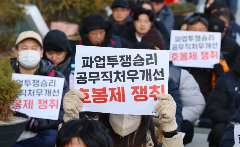 26일 오전 인천 연수구 재외동포청 앞에서 열린 재외동포청 공무직 1차 파업대회에서 참석자들이 구호를 외치고 있다. 재외동포청 공무직은 호봉제 도입과 처우개선을 요구하며 지난 16일부터 무기한 파업에 돌입했다. 연합뉴스