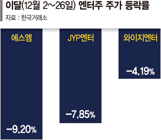 26일 한국거래소에 따르면 이달 들어(12월2일~26일) 에스엠의 주가는 9.20% 하락했다. 같은 기간 코스닥 지수(-0.38%)를 크게 밑도는 수준이다. 같은기간 JYP엔터는 7만6400원에서 7만400원으로 7.85% 하락했으며, 와이지엔터는 4.19% 떨어졌다.