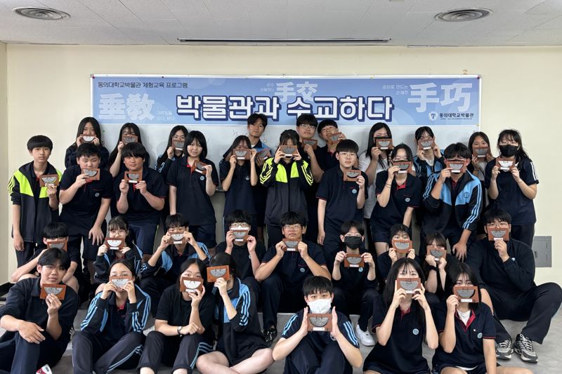 동의대 박물관이 2024년 교육기부 진로체험 인증기관 수기 공모전에서 최우상을 수상했다. 사진은 '박물관과 수교하다' 체험 프로그램 참가자들이 기념사진을 찍고 있는 모습. 동의대 제공