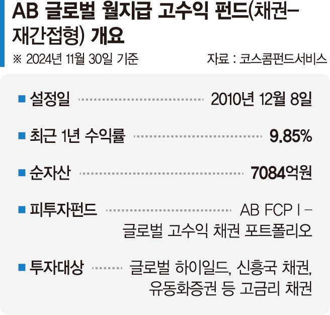 29일 코스콤펀드서비스에 따르면 'AB 월지급 글로벌 고수익' 최근 1년 수익률(11월30일 기준)은 9.85%로 집계됐다. 설정액은 7084억원으로, 올해만 4818억원이 추가된 결과다.