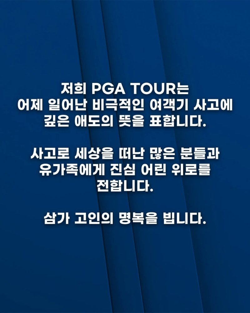 PGA 투어는 30일 소셜 미디어를 통해 "저희 PGA 투어는 어제 일어난 비극적인 여객기 사고에 깊은 애도의 뜻을 표합니다"라며 한글로 작성된 메시지를 게시했다. 이어 "사고로 세상을 떠난 많은 분과 유가족에게 진심 어린 위로를 전합니다"라고 덧붙였다. 태국 방콕에서 출발한 제주항공 여객기의 착륙 과정에서의 해당 사고로 179명이 세상을 떠난 것으로 밝혀졌다.