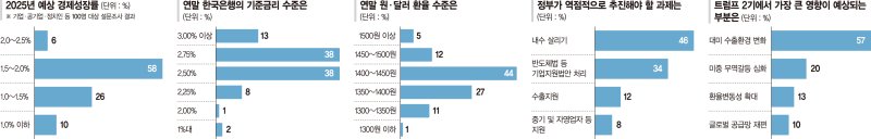 2025년 연말에는 원·달러 환율이 1400~1450원, 금리는 2.50~2.75%가 될 것으로 전망됐다. 우리 경제에 가장 큰 위기요소로는 '정치적 불확실성'과 '트럼프 2기 출범'이 꼽혔다. 또한 정부가 가장 역점을 둬야 할 과제로는 내수 살리기가 가장 많이 지목됐다. 이는 정치·사회적 혼란과 무역환경 변화 속에서 국내 소비와 투자가 활기를 되찾아야 경제 전반이 살아난다는 인식이 강해졌기 때문으로 보인다.