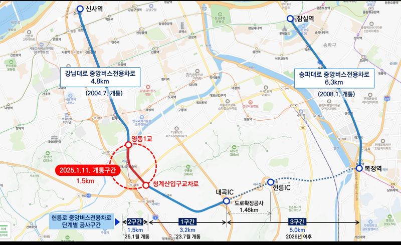 특히 이번 2구간 개통으로 약 20여 년 만에 강남대로와 헌릉로를 잇는 중앙버스전용차로가 하나로 연결돼 그 의미가 크다. 주요 교통 지역인 신사역부터 내곡IC까지 총 9.5㎞가 직결되면서, 동남권을 잇는 버스축이 탄생하는 셈이다.
