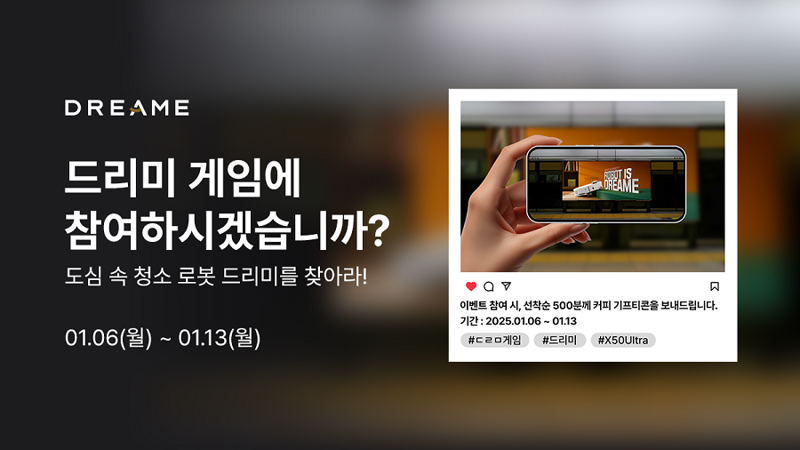 프리미엄 로봇청소기 브랜드 드리미(Dreame)가 6일부터 오는 13일까지 일주일 간 ‘드리미 게임’이라는 SNS 이벤트를 개최한다.