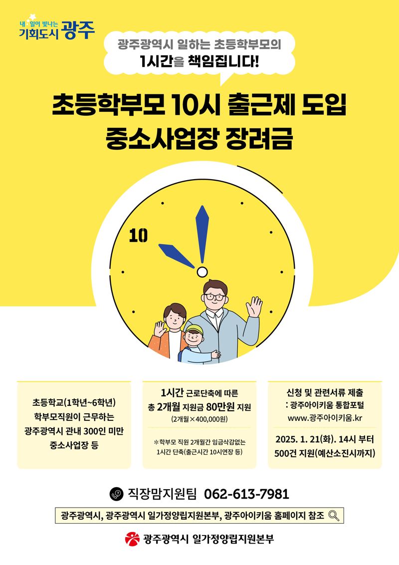 광주시에 따르면 '초등 학부모 10시 출근제'는 초등 학부모 직원의 자녀 돌봄 고충 해소를 위해 오전 10시 출근제를 도입하는 300인 미만 중소 사업장에 장려금을 지원하는 사업이다.