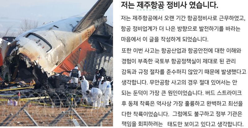 자신을 제주항공에서 오랜 기간 근무해온 항공정비사라고 밝힌 A씨는 “항공업계, 특히 제주항공의 정비사 처우는 매우 열악한 상황이며, 직원들이 부당한 상황에서도 목소리를 내기 어려운 구조를 만들고 있다”고 했다.