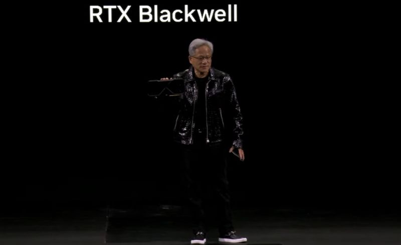 젠슨 황 엔비디아 CEO가 6일(현지시간) CES2025 기조연설에서 블랙웰 기반의 지포스 RTX 50 시리즈를 공개했다./사진=엔비디아 유튜브