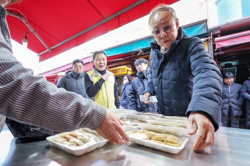 류진 한국경제인협회 회장이 7일 오후 서울 영등포구 대림동 우리시장을 방문해 '시장 소상공인 상생방안 간담회'를 마친 뒤 반찬 등을 구입하고 있다. 뉴스1