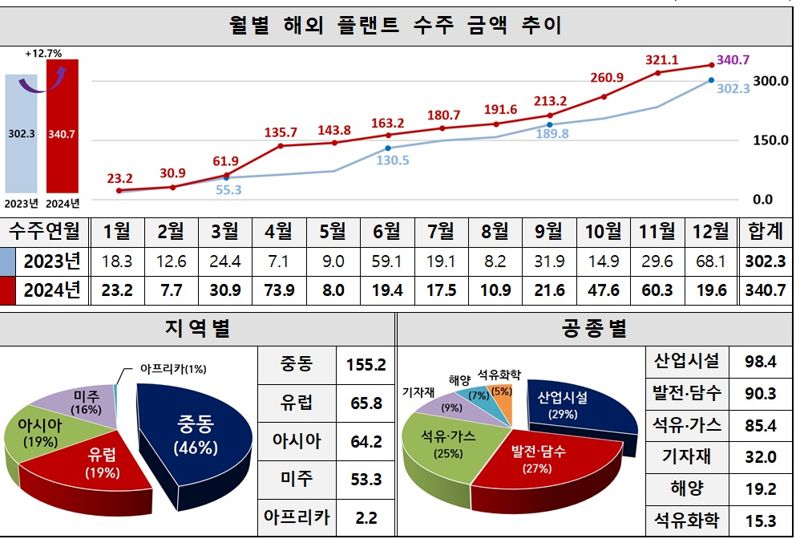 [파이낸셜뉴스] 산업통상자원부는 지난해 국내 기업들이 해외에서 플랜트를 수주한 금액이 340억7000만 달러를 기록했다고 7일 밝혔다. 이는 전년도 302억3000만 달러 대비 12.7% 증가한 금액이며 2015년 364억7000만 달러 이후 9년 만에 최대 기록이다.지난해 수주액 증가는 중동지역에서의 초대형 프로젝트 수주가 크게 기여한 것으로 나타났다. 지난해 중동에서 수주한 금액은 155억2000만 달러로 전체 수주액 대비 절반 가까운 46%를 차지한 것으로 집계됐다.