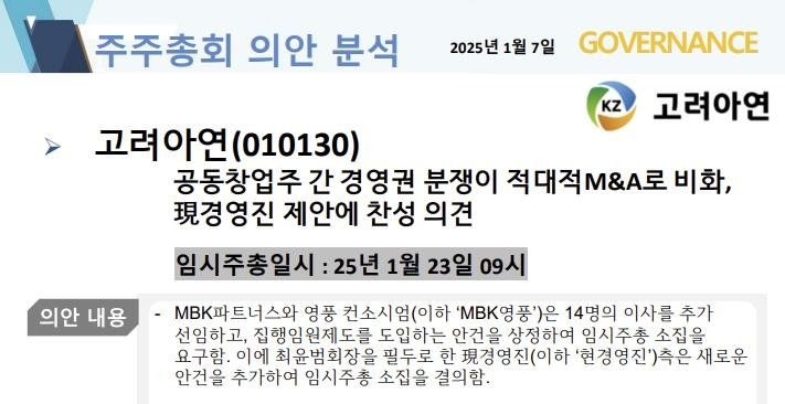 한국ESG평가원은 "경영실적 및 주주환원, 환경·사회·지배구조(ESG) 평가 등에서 고려아연이 영풍 대비 우월하다"며 "MBK라는 사모펀드 경영은 한계기업 턴어라운드에서 효과가 크지만 실적과 재무구조가 우수한 고려아연 경영에 도움이 될지 의문이고, 기업가치 제고에 우위를 갖고 있다고 판단하기 어렵다”고 밝혔다.