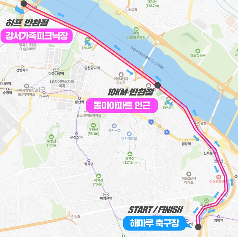 신정교 하단 안양천 해마루 축구장에 집결해 코스별 하프, 10km, 5km 순으로 출발한다. 하프, 10km, 10km커플런은 한강 가양대교(강서가족피크닉장) 방면으로, 5km, 5km가족런은 안양천변(고척스카이돔 방면)으로 운영하여 수변 경치와 봄 풍경까지 한껏 즐기며 달릴 수 있을 전망이다.