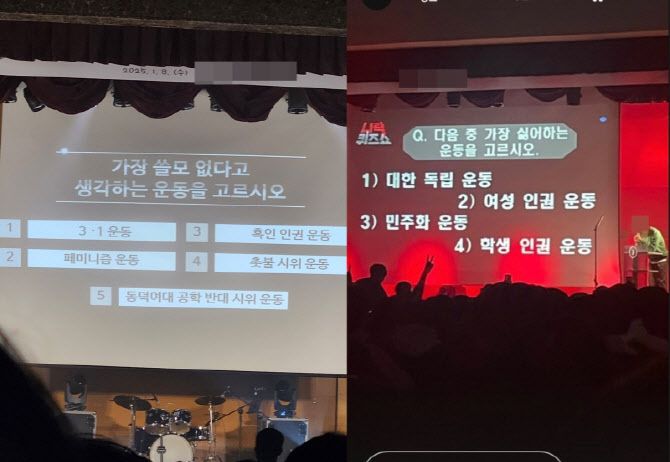 문제가 된 '나락퀴즈쇼'에서는 '가장 쓸모 없다고 생각하는 운동을 고르시오'라는 물음과 함께 '3·1운동' '흑인 인권 운동' '페미니즘 운동' '동덕여대 공학 반대 시위 운동' 등이 선택지로 나왔다.