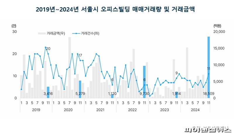 [파이낸셜뉴스] 지난해 11월 서울 오피스빌딩 거래금액이 1조8500억원을 넘어서며 2019년 이후 최고를 기록한 것으로 나타났다.