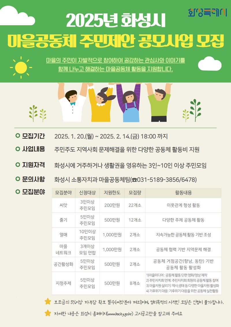 【파이낸셜뉴스 화성=장충식 기자】 경기도 화성시는 주민 주도의 마을문제 해결과 공동체 활성화를 위한 '2025년 마을공동체 주민제안 공모사업' 참여자를 오는 13일부터 2월 14일까지 모집한다고 9일 밝혔다.