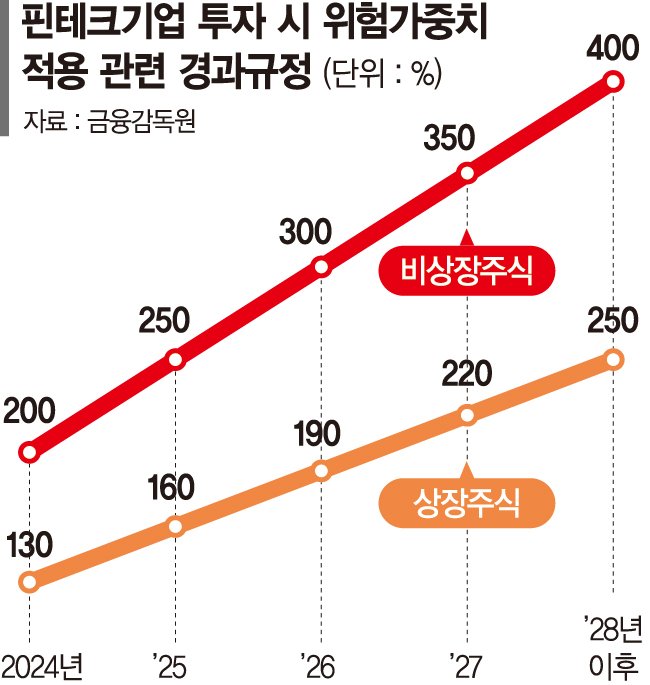 금융지주들이 지분율 15%까지 투자하기 위해서는 비상장기업 투자와 관련한 위험가중치 등 자본비율 규제를 풀어줘야 한다는 지적도 나온다. 핀테크기업에 투자할 때 위험가중치는 올해 기준 약 250%이고, 오는 2028년에는 약 400%까지 높아진다.