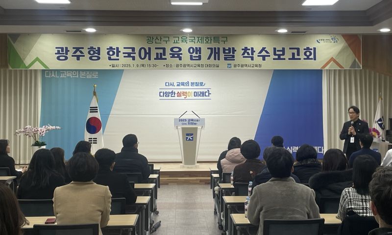 광주광역시교육청이 다문화 학생의 한국어 교육을 돕기 위해 전국 최초로 지역 특색을 반영한 '광주형 한국어교육 앱'을 개발하기로 하고 지난 9일 본청 대회의실에서 착수 보고회를 개최했다. 광주광역시교육청 제공