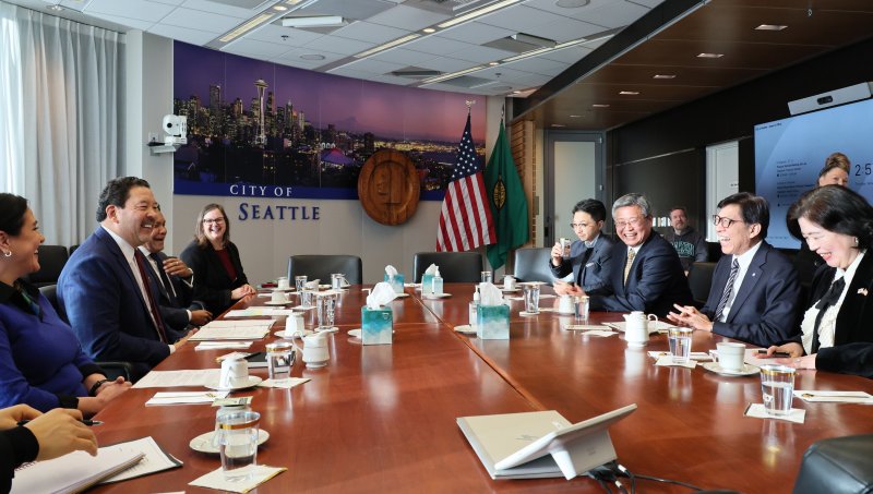 지난 9일(현지시각) 박형준 부산시장(오른쪽 첫번째)이 미국 순방 기간, 시애틀시청을 찾아 브루스 해럴(왼쪽 첫번째) 시장과 도시 간 상호 교류 협력 증진 방안 등을 논의하고 있다.