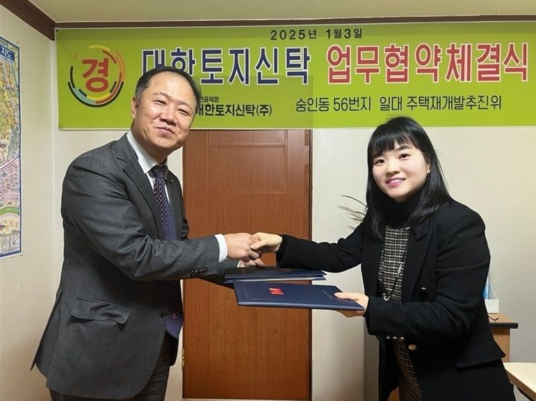 [파이낸셜뉴스] 대한토지신탁은 서울 종로구 숭인동 56일대 주택재개발정비사업 추진준비위원회와 업무협약(MOU)을 체결했다고 13일 밝혔다. 앞서 대토신은 ‘숭인동 56 일대 주택재개발’ 정비사업 예비신탁사로 선정됐다. 현재 사업시행자 지정을 앞두고 있다.
