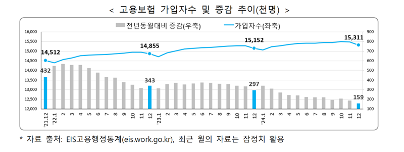 13일 고용노동부가 발표한 '2024년 12월 고용행정 통계로 보는 노동시장 동향'에 따르면 지난해 12월 말 기준 고용보험 상시 가입자는 1531만1100명으로 집계됐다. 전월보다 15만 9000명 증가했는데, 월별 증감폭은 2020년 5월 이후 55개월만에 가장 낮았다.