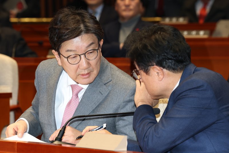 권성동 국민의힘 원내대표와 박형수 원내수석부대표가 13일 오후 서울 여의도 국회에서 열린 의원총회에서 대화하고 있다. 뉴스1