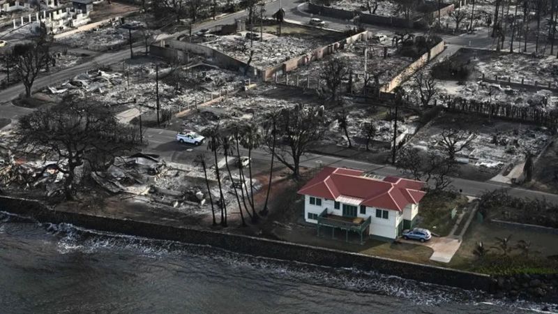 2021년 하와이 산불로 마을이 초토화된 가운데 유일하게 살아남은 '붉은 지붕' 집 /사진=BBC 캡처