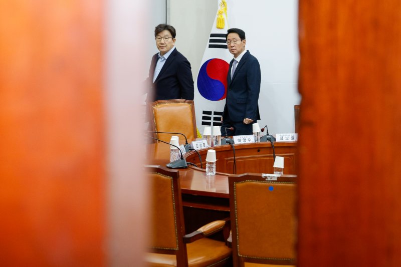 고위공직자범죄수사처가 윤석열 대통령 체포영장 집행을 위해 관저에 도착한 15일 오전 권성동 국민의힘 원내대표, 김상훈 정책위의장 등이 서울 여의도 국회에서 열린 비공개 원내전략회의에 참석하고 있다. /사진=뉴스1화상