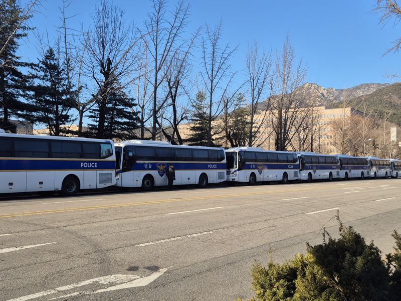 15일 오전 공수처 사무실이 위치한 경기 과천시 정부과천청사 주변에는 경찰버스 10여대가 배치됐다. 지난 3일 1차 체포영장 집행 당시 경기남부경찰청 소속 14개 중대 840여명과 경찰버스 51대를 동원해 차벽을 설치했던 것과 비교하면, 이날은 배치 규모가 상대적으로 축소된 모습이다.