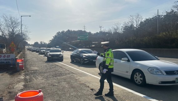 부산지역 정체 구간 도로에서 경찰이 교통관리를 하고 있는 모습. 부산경찰청 제공