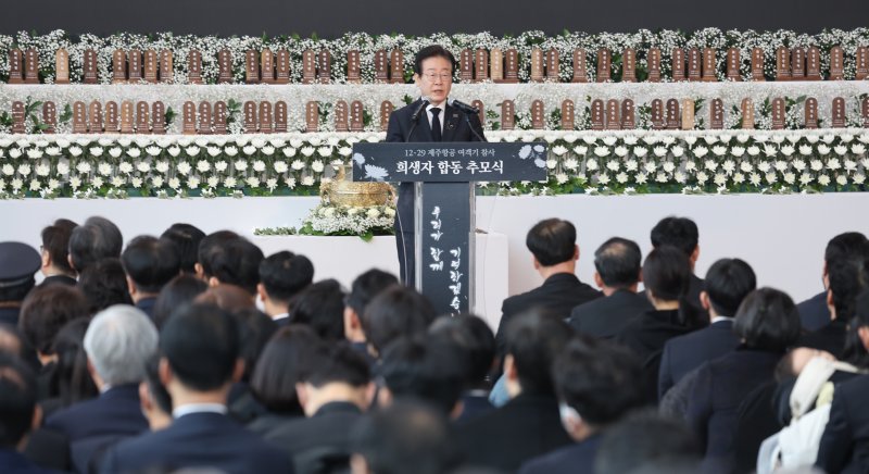 이 대표는 이날 전남 무안국제공항에서 열린 '12.29 제주항공 여객기 참사 희생자 합동 추모식'에서 "다시는 이러한 비극이 되풀이되지 않도록 필요한 제도와 정책을 정비해야겠다"며 이같이 말했다.