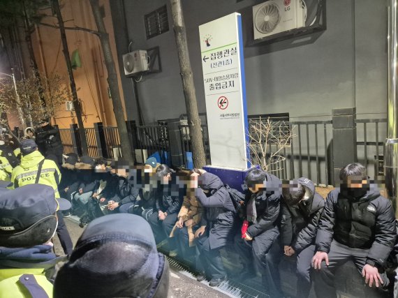 18일 오후 6시 8분께 서울서부지법 뒤쪽 담장을 넘어 법원에 침입했다가 체포된 남녀 17명/사진=최은솔 기자