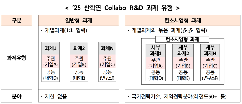 2024년까지는 일반형 과제를 통해 중소기업이 1개의 대학 또는 연구기관의 자유공모 과제를 수행할 수 있었다. 올해부터는 컨소시엄형 과제를 추가 도입해 중소기업과 복수의 대학·연구기관 간 협력을 통해 국가전략기술분야와 레전드50+ 등의 지역전략분야를 집중 육성할 계획이다.