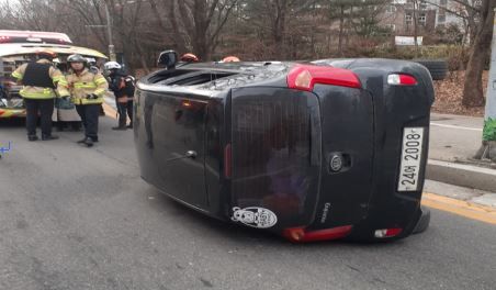 19일 경기도소방재난본부에 따르면 오전 8시 54분 경기 광명시 소하동의 한 아파트 앞 도로에서 경차가 좌측으로 전도되는 사고가 발생했다.
