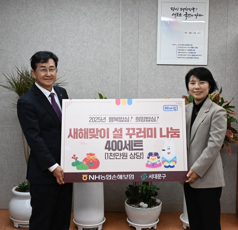 NH농협손해보험이 설 명절을 앞둔 지난 17일 서울 서대문구청(구청장 이성헌)을 찾아 취약계층을 위한 설 꾸러미 400세트를 전달했다고 20일 밝혔다. 농협손보 송춘수 대표이사(사진 왼쪽)와 강지현 서대문구 부구청장이 기념사진 촬영을 하고 있다. 사진=NH농협손해보험 제공
