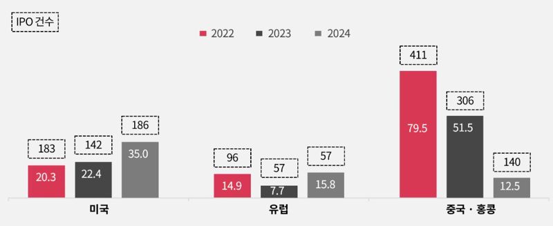 20일 삼일PwC가 20일 발간한 ‘PwC 글로벌 IPO 실적 및 2025년 전망’ 보고서에 따르면 지난 2024년 글로벌 IPO 조달 금액은 총 1056억 달러(약 154조 원)로 전년 대비 9% 감소했다. 중국과 홍콩의 IPO 활동이 위축된 것이 주된 요인으로 꼽힌다. 반면 미국과 유럽에서는 조달 금액이 전년보다 각각 57%, 105% 증가하며 뚜렷한 회복세를 보였다. 보고서는 “미국 대통령 선거가 가져온 불확실성과 일부 유럽국가의 경제 둔화 등에도 불구하고 이뤄낸 성과”라고 평가했다.