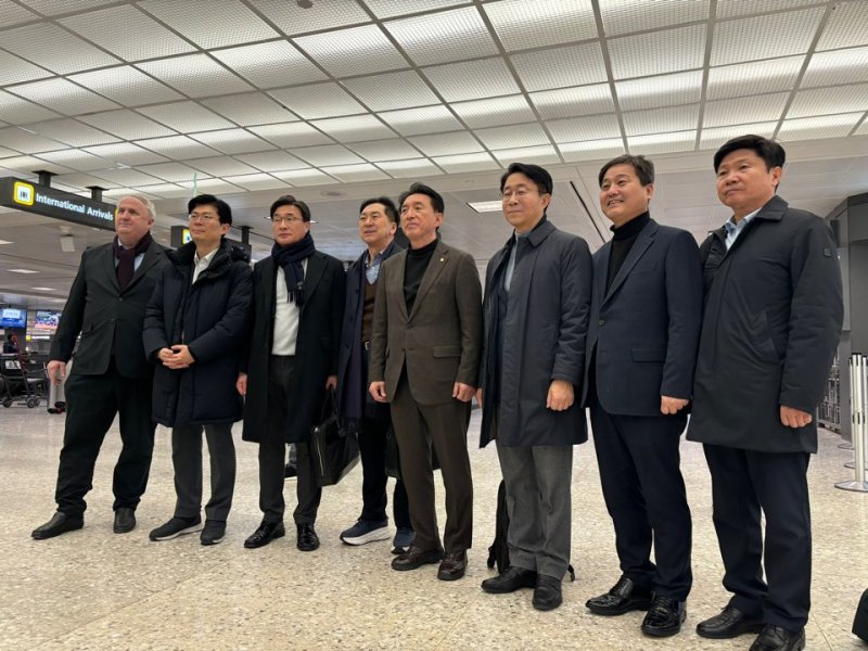 도널드 트럼프 미국 대통령 당선인 취임식을 계기로 대미 직접 외교에 나선 국회 외교통일위원회 대표단 등이 18일(현지 시간) 워싱턴DC 인근 덜레스국제공항에 도착했다. 왼쪽부터 인요한·조정훈·김대식·김기현·김석기 국민의힘 의원, 조정식·김영배·홍기원 의원.뉴시스