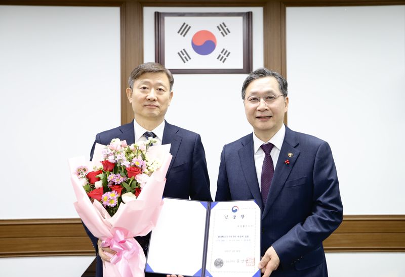 이상철 한국항공우주연구원 신임 원장(왼쪽)이 20일 대전 항공우주연구원 본원에서 윤영빈 우주항공청장으로부터 임용장을 받은 뒤 기념촬영을 하고 있다. 항공우주연구원 제공
