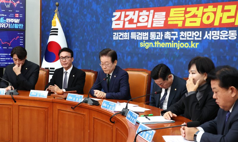[서울=뉴시스] 조성우 기자 = 이재명(가운데) 더불어민주당 대표와 박찬대(오른쪽 세 번째) 원내대표 등 최고위원들이 지난 18일 오전 서울 여의도 국회에서 열린 최고위원회의에 참석해 자리하고 있다. 2024.11.18. xconfind@newsis.com /사진=뉴시스