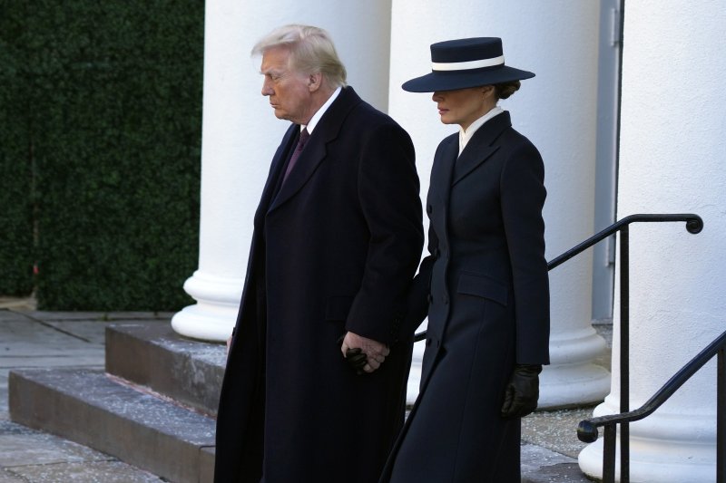 트럼프 당선인은 검은색 코트에 자주색 넥타이를 착용했다. 또 멜라니아 여사는 검은색 코트에 흰색 테두리 장식이 된 챙이 검은색의 넓은 원형 모자 차림이었다.