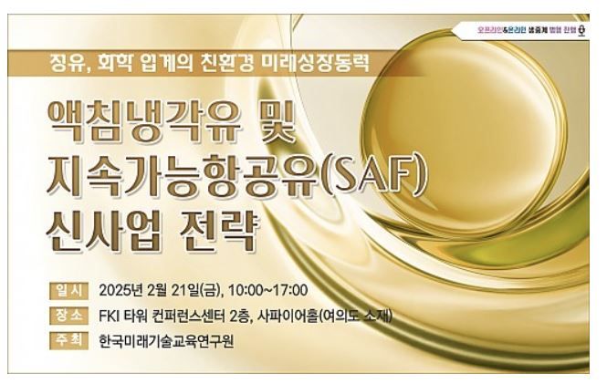 [파이낸셜뉴스] 한국미래기술교육연구원은 오는 2월 21일 '액침냉각유 및 지속가능항공유(SAF) 신사업 전략 세미나'를 서울 여의도 FKI타워 사파이어홀에서 온, 오프라인으로 병행 개최한다고 21일 밝혔다.