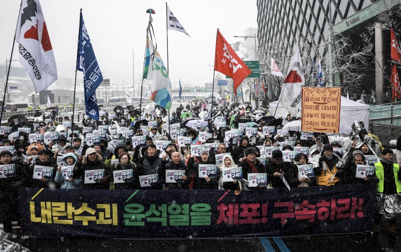 대통령 관저 앞 집회에서 경찰 무전기를 빼앗아 던져 경찰관에게 상해를 입힌 전국민주노동조합총연맹(민주노총) 조합원이 구속됐다.