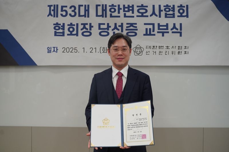 김정욱 신임 대한변호사협회장이 21일 당선증을 받고 기념 촬영을 하고 있다. /사진=대한변호사협회