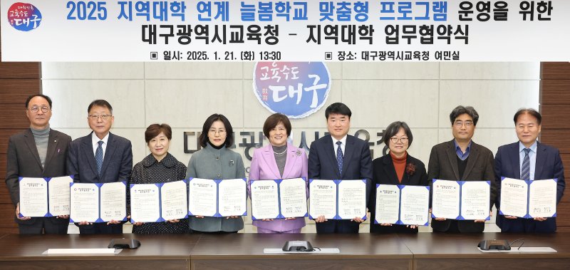 대구교육청은 21일 대구교육청 여민실에서 지역대학 8곳과 '2025학년도 늘봄학교 맞춤형 프로그램 운영'을 위한 업무협약을 체결했다고 밝혔다.
