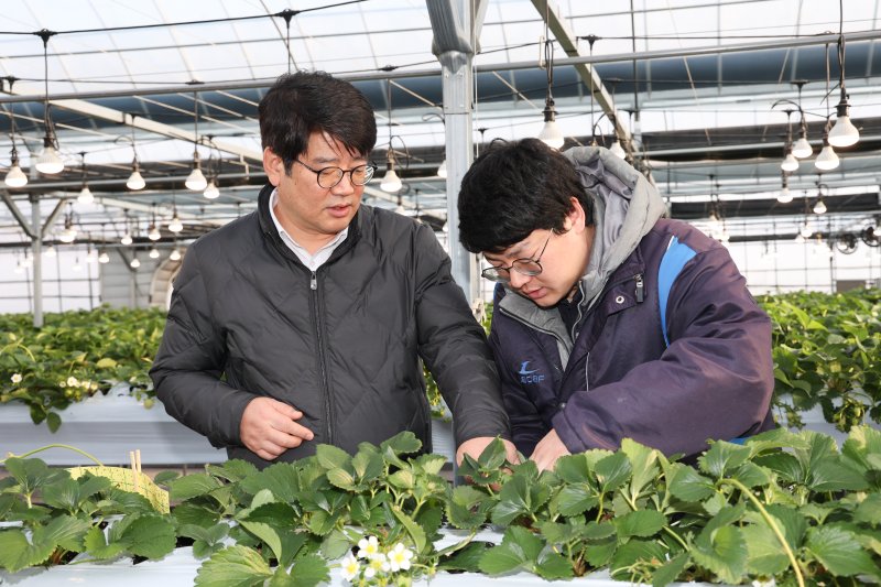 지난 7일 경기도 화성시 딸기 시설재배 농가에서 권재한 농촌진흥청장(왼쪽)이 생육 상황을 점검하고 있다. 농업진흥청 제공