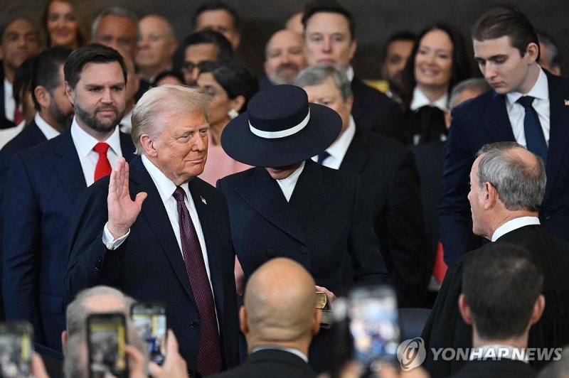 21일(현지시간) 워싱턴 국회의사당에서 미국 47대 대통령 취임 선서를 하고 있는 도널드 트럼프. 연합뉴스