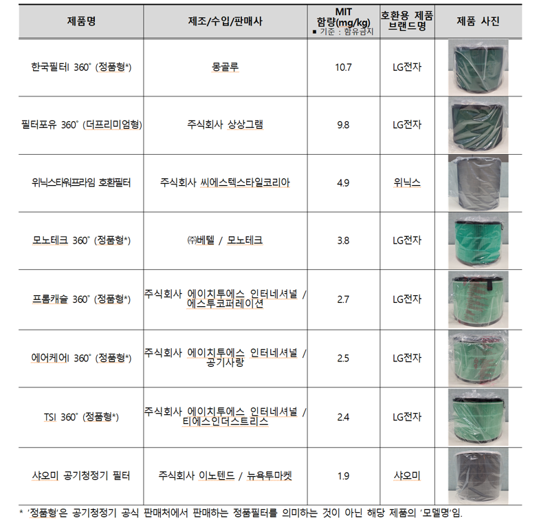 이번 안전성 조사 결과, 조사대상 42개 중 8개 제품에서 필터형 보존처리 제품에 사용을 금지하고 있는 메틸이소티아졸리논(MIT)이 최소 1.9mg/kg에서 최대 10.7mg/kg 검출돼 부적합한 것으로 확인됐다.