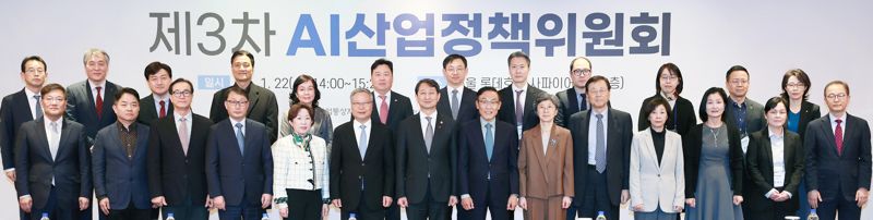 22일 서울 중구 롯데호텔에서 열린 제3차 AI 산업정책위원회에 참석한 안덕근 산업통상자원부 장관(앞줄 가운데)과 관계자들이 기념촬영을 하고있다. 산업통상자원부 제공.