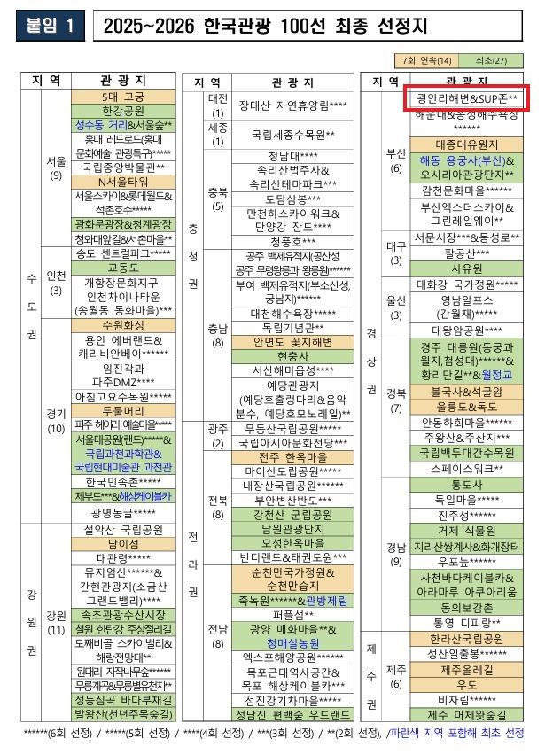 광안리SUP존 2025-26 한국관광 100선 선정지 명단. 수영구 제공