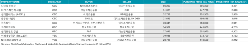 *주요 오피스 거래 현황. 자료:쿠시먼앤드웨이크필드